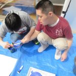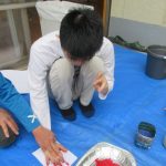 みんなの手形をとり、その手形を支援員が下書きした鯉の絵に貼り付けていきます。